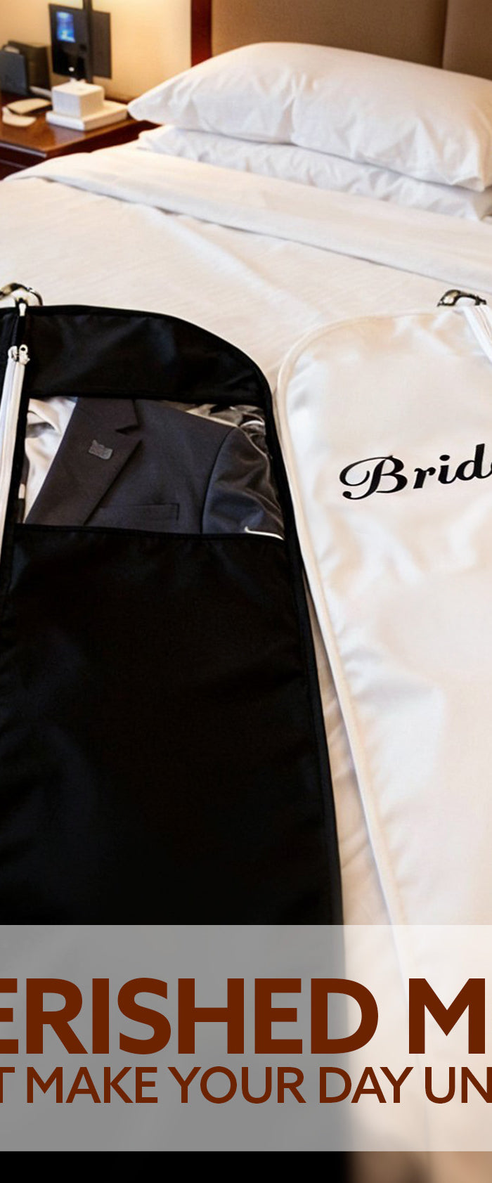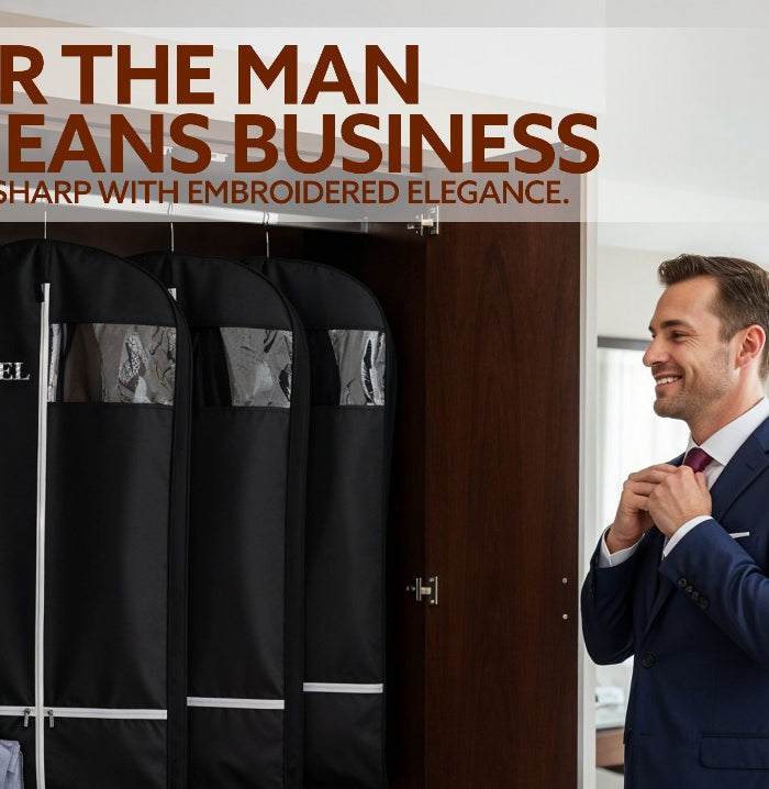 Embroidered Garment bag for weddings, bridal attire, and groom's tuxedos - Choose your thread color and font to personalize your statement piece for your special day. Custom black wedding bag ideal for travel, suit covers, and storage of bridal gowns, groom's tuxedos, and wedding attire Available in 3 Sizes: 43'', 54'', and 60'' - to perfectly accommodate different hanging garment bag lengths and ensure a customized fit Sturdy carry handle for easy transportation on the go, whether you're heading to your wedding venue, a rehearsal dinner, or a pre-wedding photo shoot, you are covered with our personalized garment hanger, ensuring your attire stays pristine and ready for your special day Premium breathable fabric with 2 mesh pockets to ensures fresh, crease-free clothing during transit, protecting delicate fabrics and intricate designs 📧 Have Questions? Logo or Image Uploads?Email us at Service@CustomEmpireShop.com, and we’ll be happy to assist you!