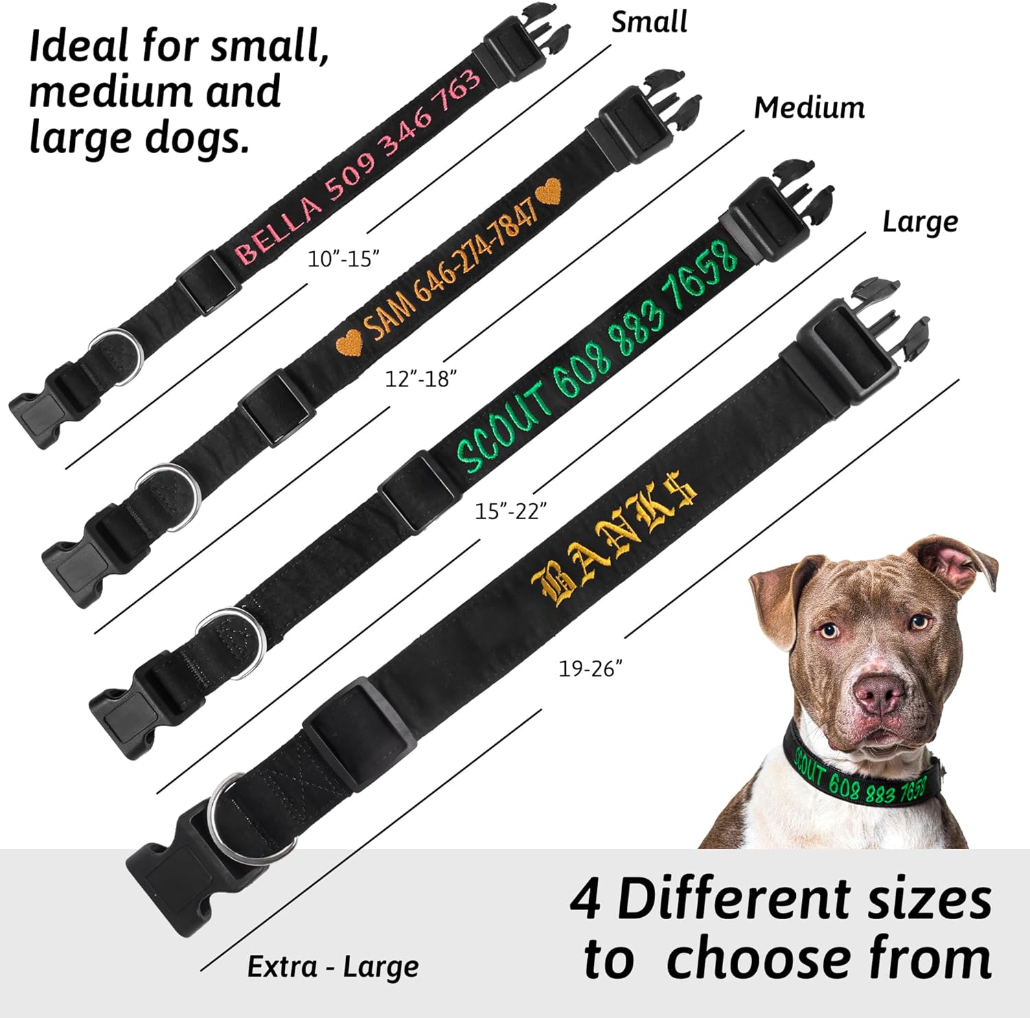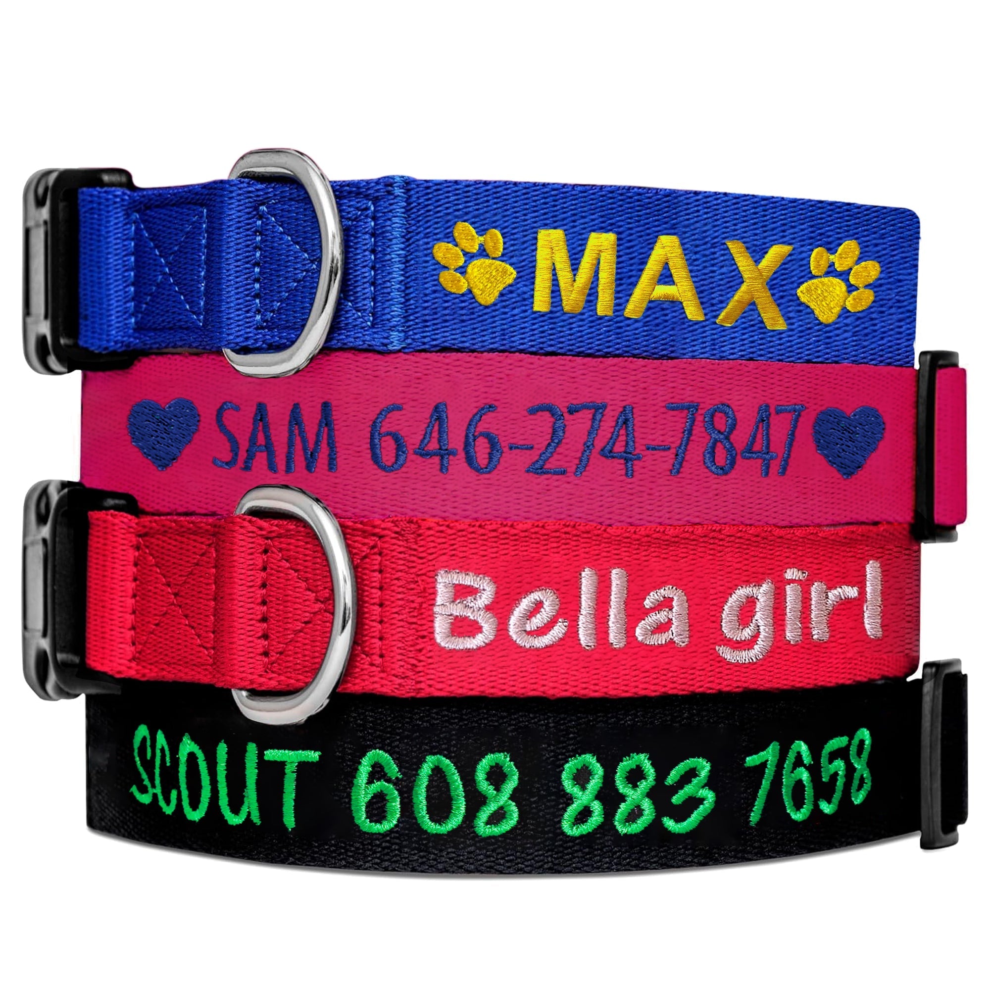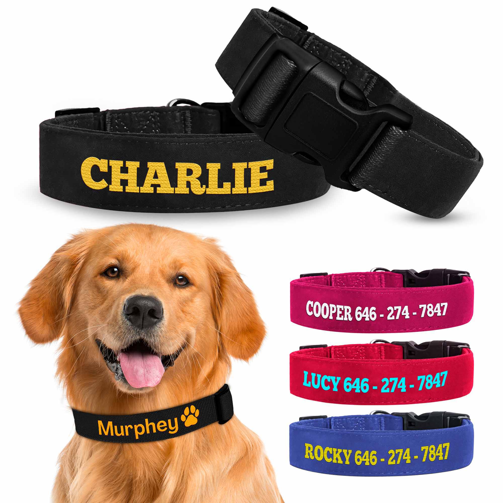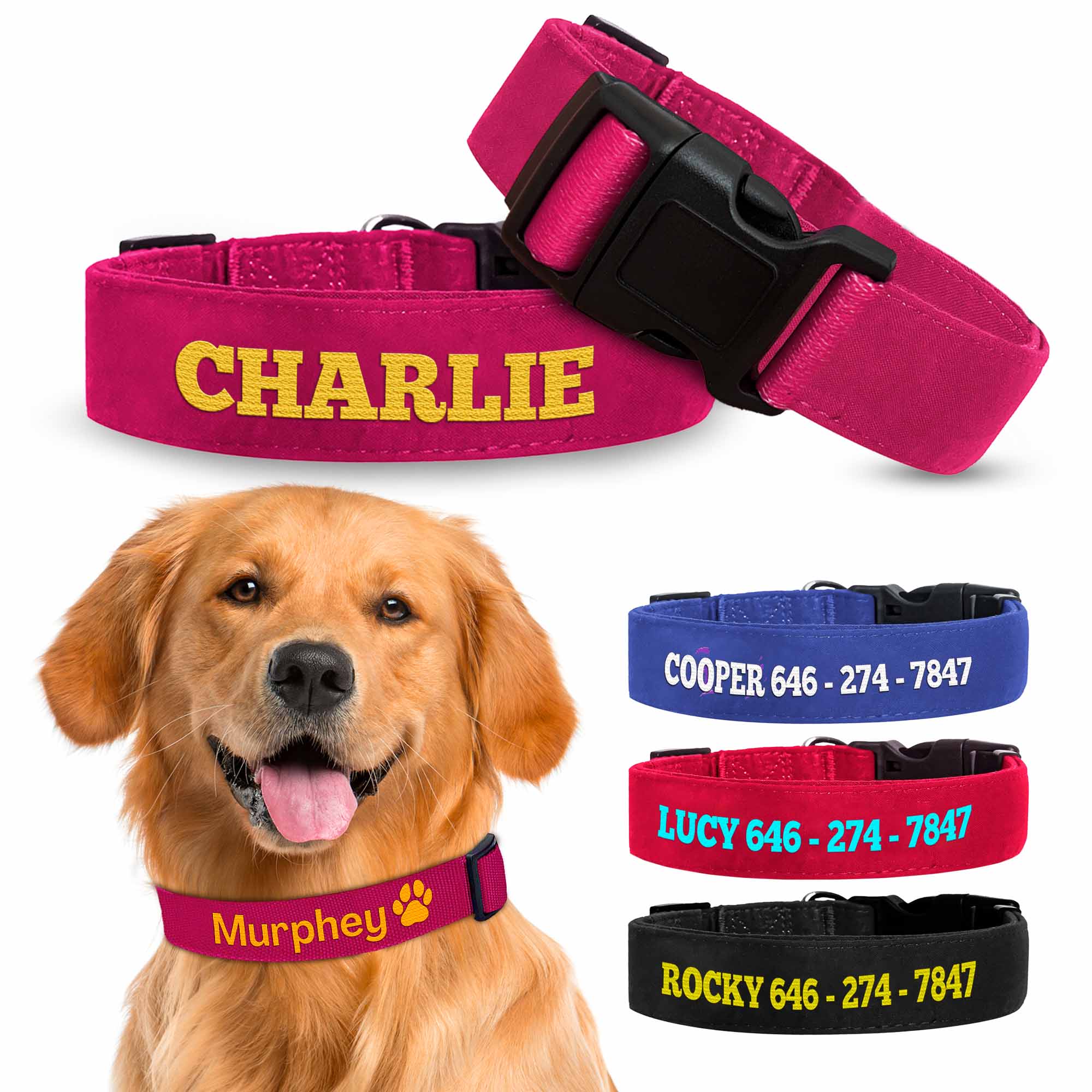 - Relieve your worries with our custom embroidered dog collar, ensuring your beloved pet's identity is always unmistakable. Say goodbye to noisy tags and fretting over their whereabouts. Upgrade to a collar that confidently declares, "I am cherished and safeguarded," providing both safety and style.
