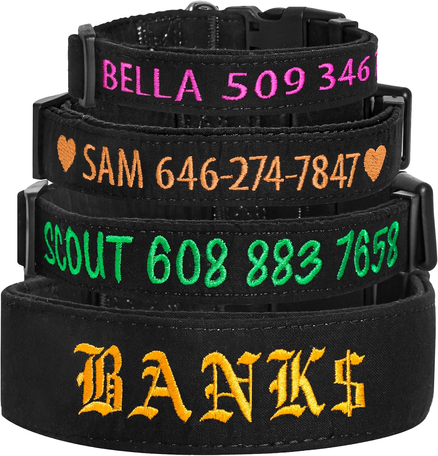- Relieve your worries with our custom embroidered dog collar, ensuring your beloved pet's identity is always unmistakable. Say goodbye to noisy tags and fretting over their whereabouts. Upgrade to a collar that confidently declares, "I am cherished and safeguarded," providing both safety and style.