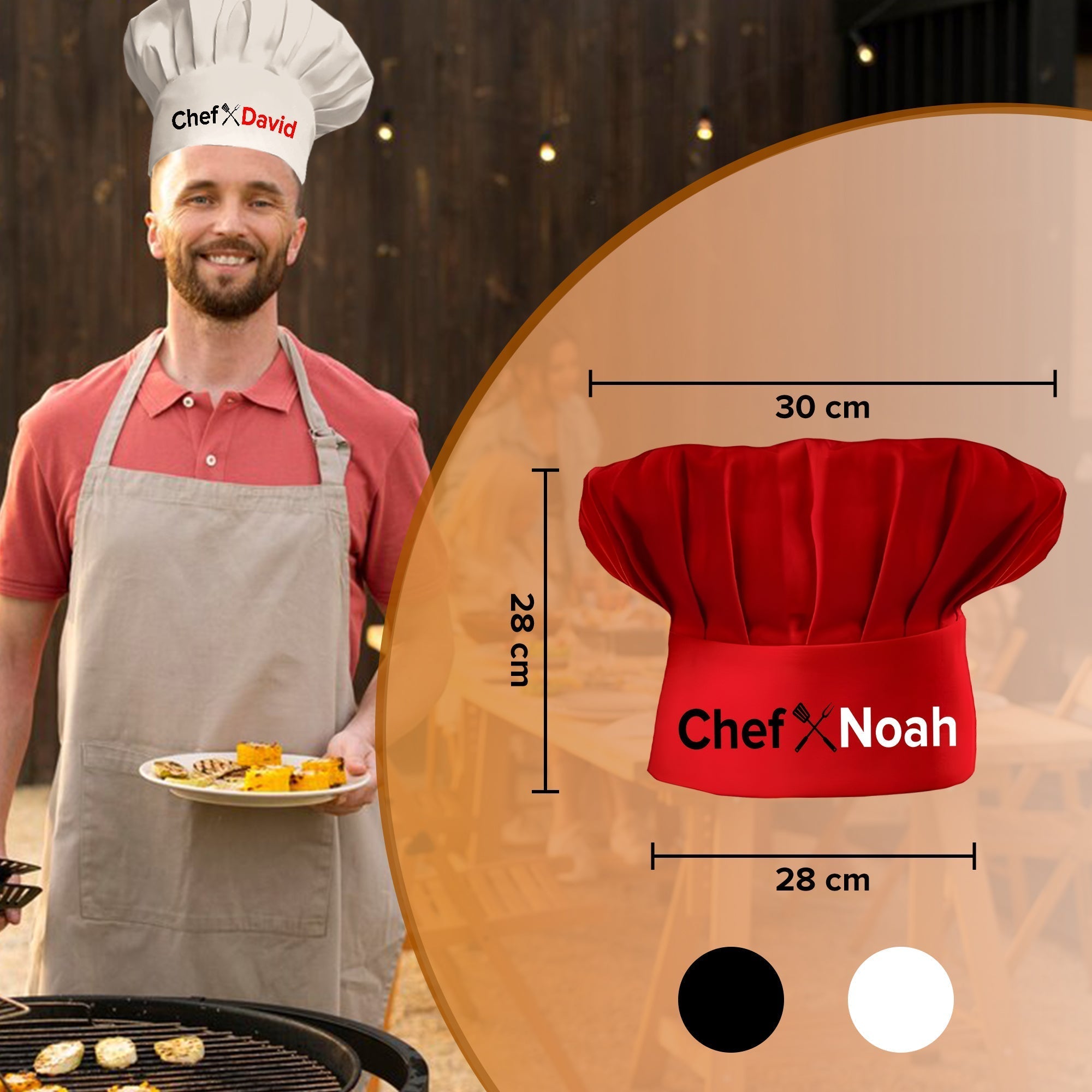 - Personalized Men Chef Hat: Elevate your kitchen and grill experience with this personalized chef hat with a custom name. Adding a unique and stylish touch to your culinary adventures, this hat is sure to make you stand out as the reigning monarch of the barbecue kingdom