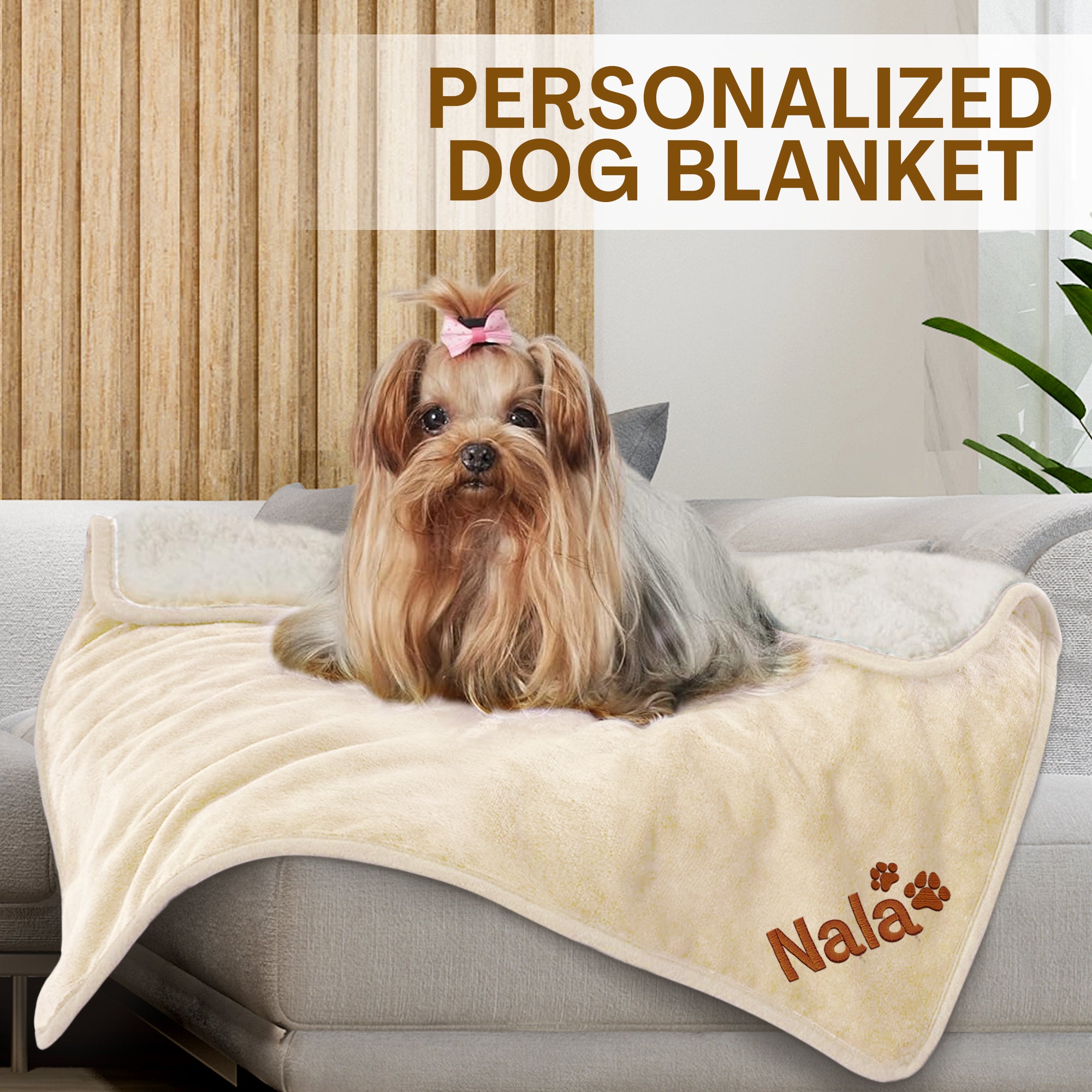 Whether it's for lounging on the dog bed, cuddling up in the car during travels, or enjoying the great outdoors, this blanket is the perfect companion for any adventure. What sets this blanket apart is the personalized touch it offers. Each personalized blanket is meticulously embroidered with your dog's name, surrounded by adorable paw prints, adding a special charm that celebrates your pet's unique identity. It's not just a blanket; it's a cherished keepsake that honors the bond between you and your furry friend. This custom blanket isn't just for your dog—it's a thoughtful gift for any dog lover in your life. Whether it's a birthday, holiday, or just because, this personalized gift is sure to warm hearts and bring smiles to faces.
