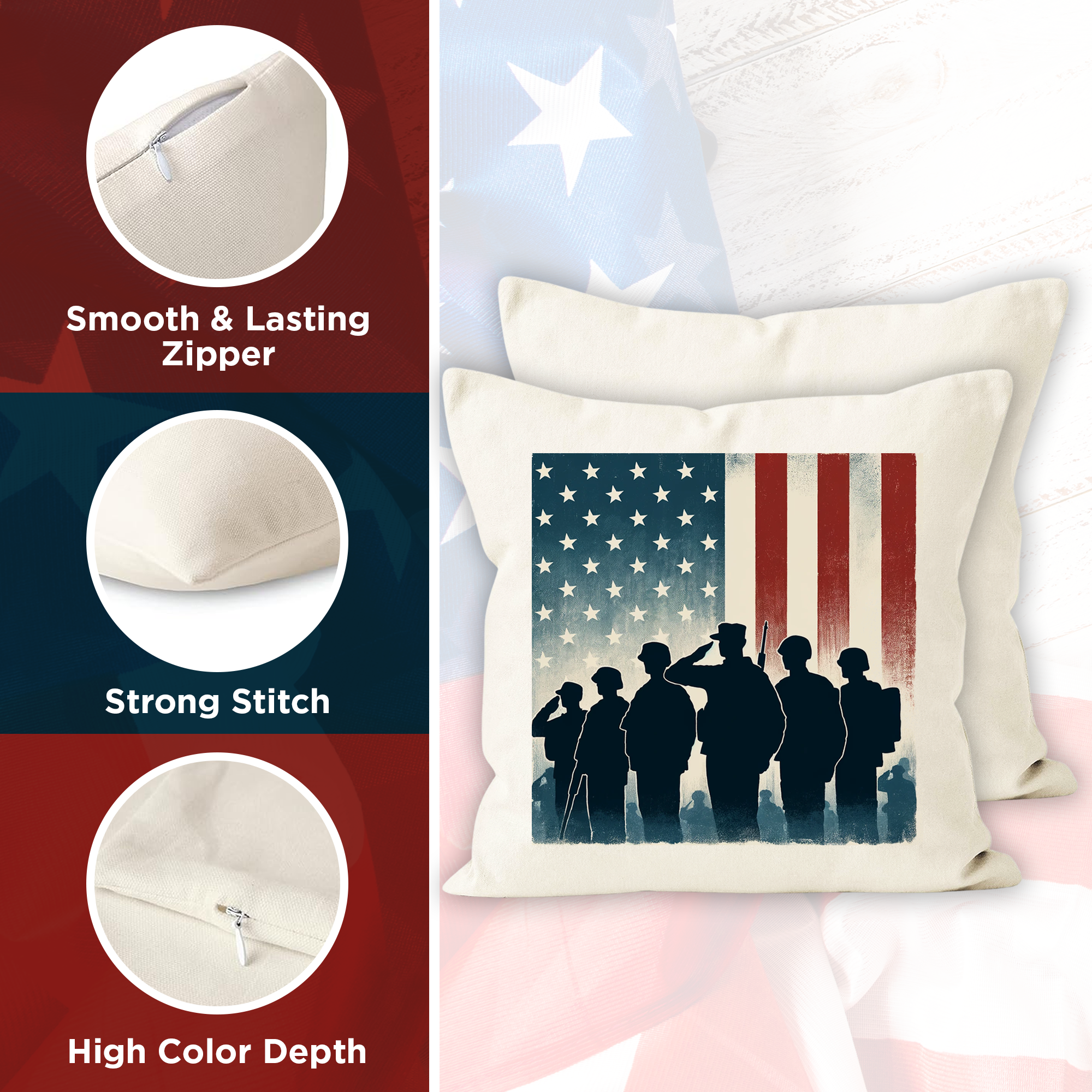 - Patriotic Design: This pillowcase features a soldier silhouette against the American flag, perfect for Memorial Day, Independence Day, and Veterans Day decor. The vivid colors and symbolic imagery honor our military heroes and add a touch of patriotism to any room.