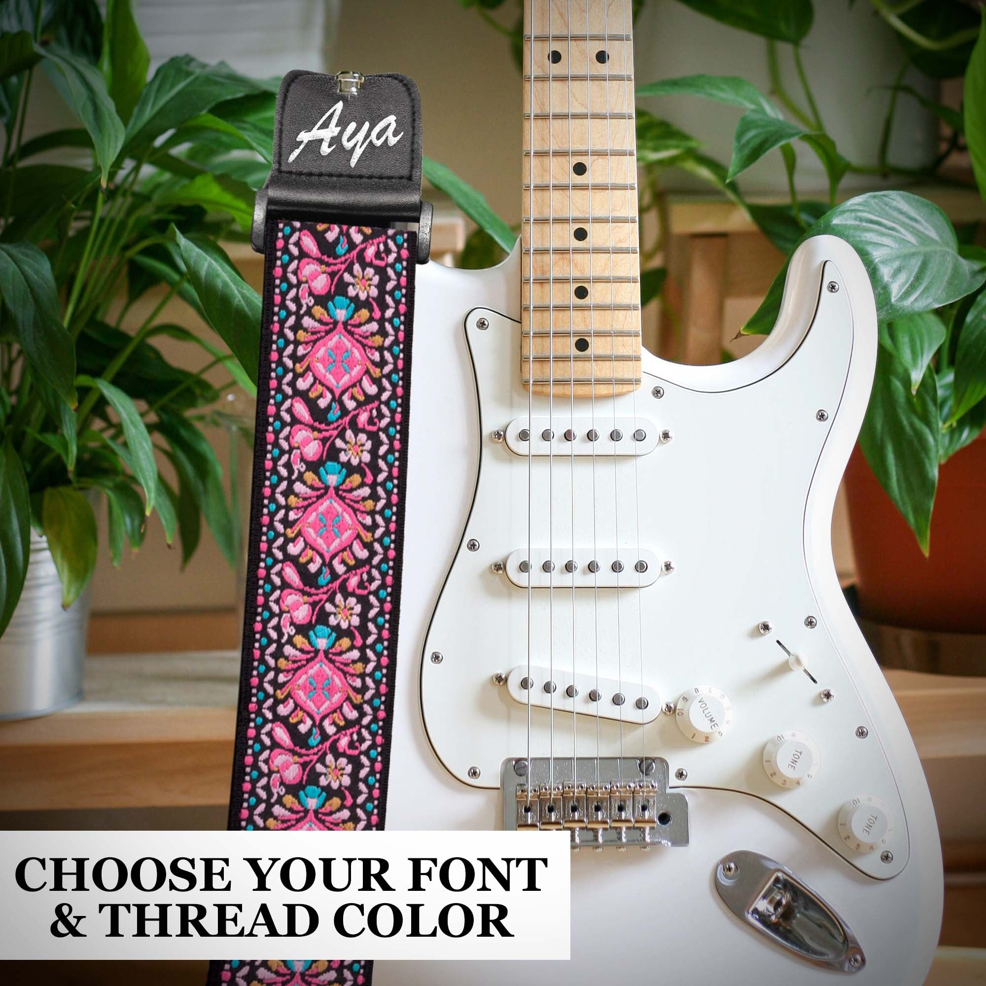Custom Pink Woven Vintage Design Guitar Strap W/FREE BONUS- 2 Picks + Strap Locks + Strap Button