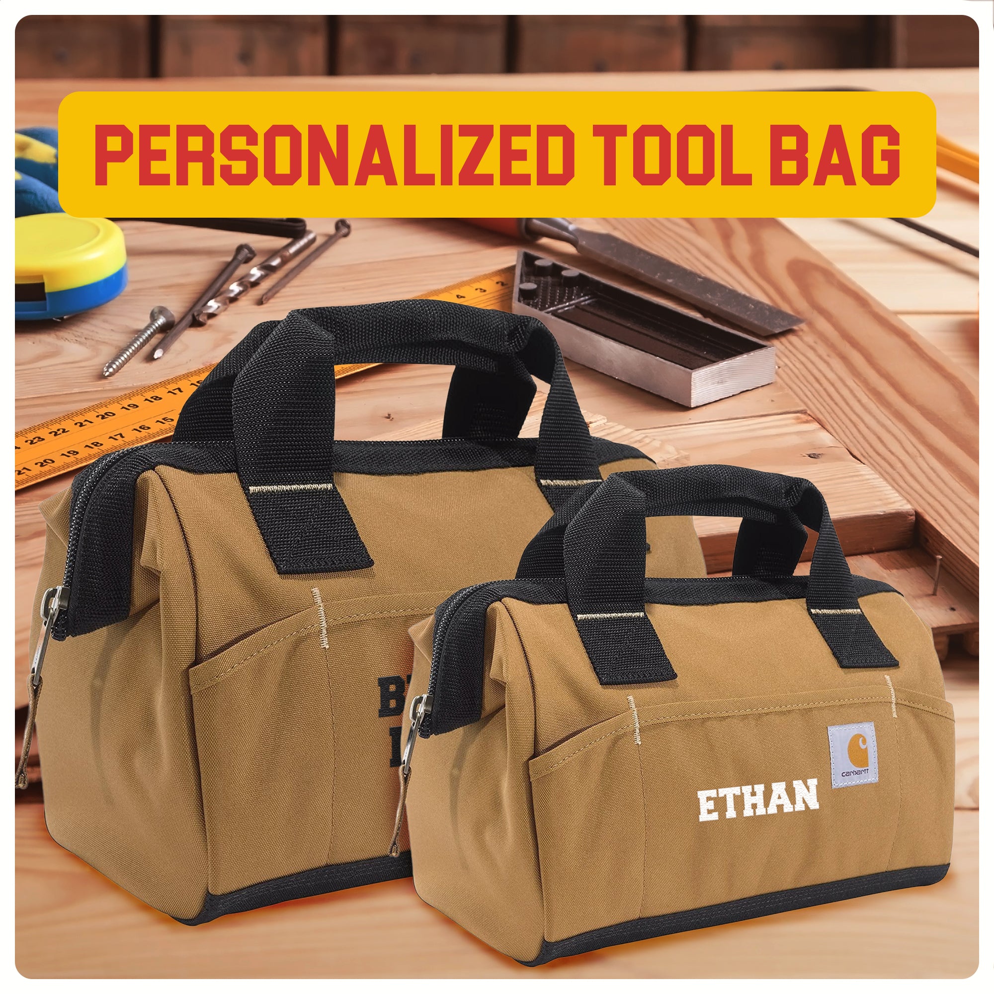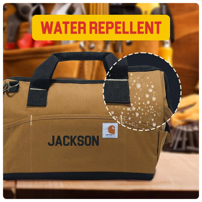 Durable tool bag with large, zippered main compartment, 6 exterior pockets, 15 interior pockets and loops